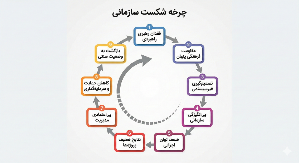 • چرخه معیوب شکست: تبیین چگونگی شکل‌گیری یک توالی مخرب که از ضعف رهبری آغاز شده و به بی‌اعتمادی مدیریت و بازگشت به وضعیت سنتی ختم می‌شود.